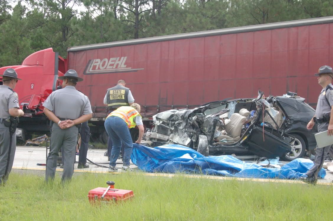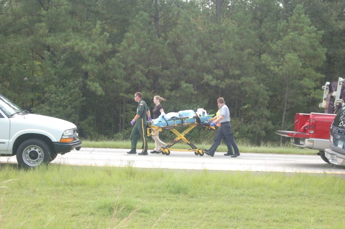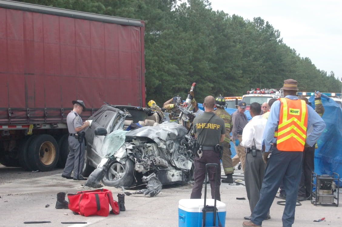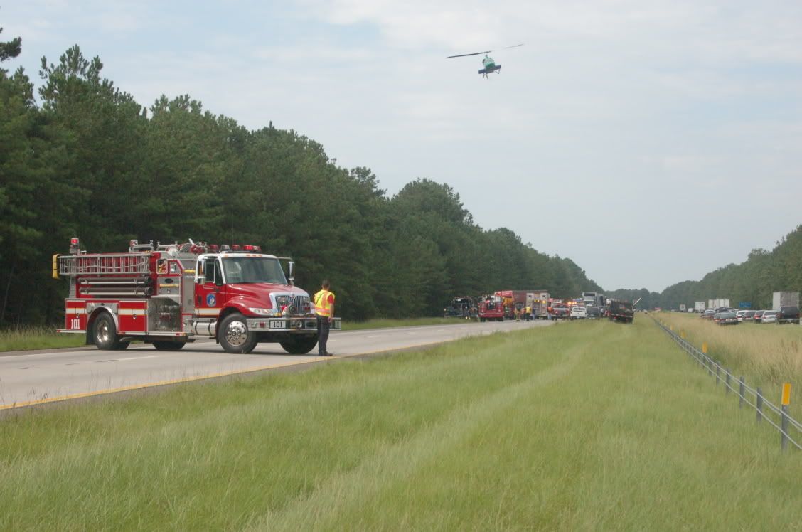 At 9:50 a.m., traffic started to slow down. At 10 a.m. I was at a complete stop. Firetrucks came flying up the right-hand-side service lane and I called Andy. I was stuck at a mile marker telling me that I was 9 miles from my home exit. I asked him what had happened. Turns out, a BAD wreck had just occured ahead of me. About a mile ahead of me. A man and a 14-year-old were running from the cops on the interstate and drove over the median. The were flying southbound in the northbound highway when they smacked an 18-wheeler. The driver of the truck was fine, but his rig had a busted fuel tank. The driver of the Lexus had to be "scraped" out. The 14-year-old was ejected from the car and had to be airlifted from the scene. I was stuck there from 10 a.m. until 12:30 a.m. Since the southbound lane was moving along fine, Andy made it to the scene (he was the first reporter on the scene since I alerted him to it before fire and rescue even made it there). He got his story and his photos, drove down and parked in the median to say hi to me, and left going southbound to hit an exit 10 miles down and to take a backroad home. He called me from home to say "I'm here!"